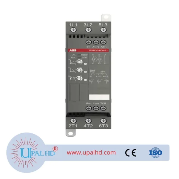 ABB compact soft starter starter controller PSR30-600-11; 10134120 Industrial Control Product Model Number: PSR30-600-11 The softstarter PSR30-600-11 has a rated maximum operational current of 30 A with an operating voltage span from 208…600 V AC. The rated control voltage is 24 V AC/DC. PSR features a two-phase control soft start and stop through a voltage ramp. It has a built-in bypass for easy installation and energy saving. A RUN and a TOR signal is available from a relay output in NO (normally open state). The start/stop ramp and time is easy to set by three potentiometers on the front. PSR is often used in combination with a manual motor starter (MMS) from ABB, so mechanical connection kits are available. Another popular option is Fieldbus communication, which can be enabled by an external adaptor and a Fieldbus plug. The PSR range is our most compact softstarters with basic functionality and values. They are suitable for small three-phase motors with nominal currents from 3…105 A and can manage up to 100 starts per hour. Common applications are, for example, pumps, fans, compressors, and conveyors. ABB compact soft starter starter controller