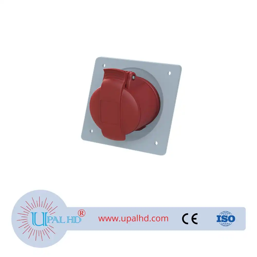 - Panel mounted socket, earthing sleeve position 6h, rated current 16A, IP44 splashproof, unified flange, angled, 3-poles+neutral+earth, frequency 50-60 Hz, color code Red