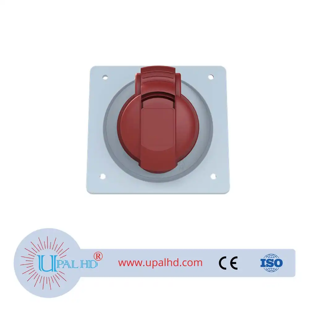 ABB industrial connector 16A four-phase 316RAU6 female socket plug splash-proof IP44; 10091785.ABB Industrial Connectors Model No: 316RAU6. Panel mounted socket, earthing sleeve position 6h, rated current 16A, IP44 splashproof, unified flange, angled, 3-poles+earth, frequency 50-60 Hz, color code Red.
