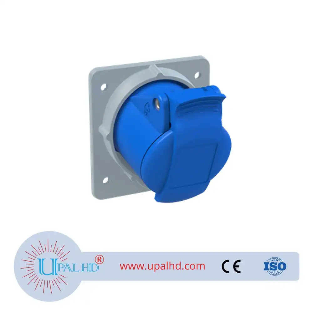 Panel mounted socket, earthing sleeve position 6h, rated current 16A, IP44 splashproof, minimized flange, angled, 2-poles+earth, frequency 50-60 Hz, color code Blue