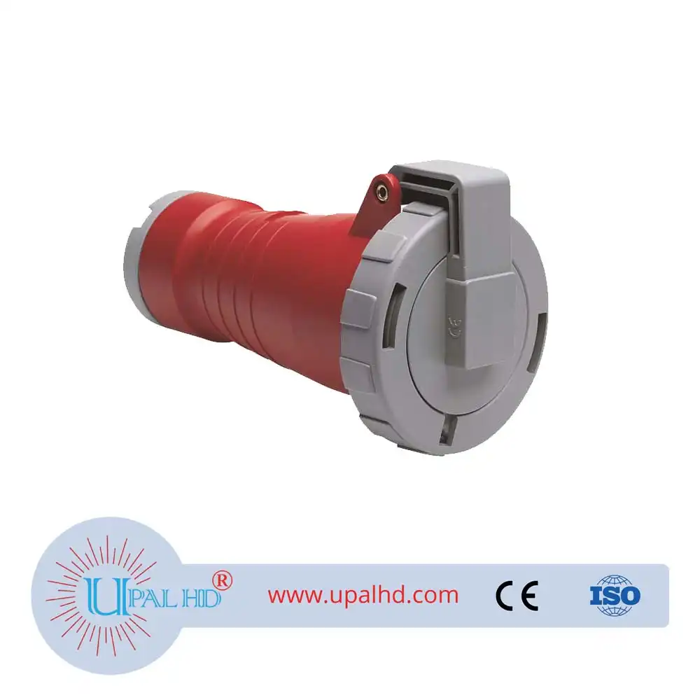 - Connector, earthing sleeve position 6h, rated current 32A, IP67 watertight, 3-poles+earth, frequency 50-60 Hz, color code Red.