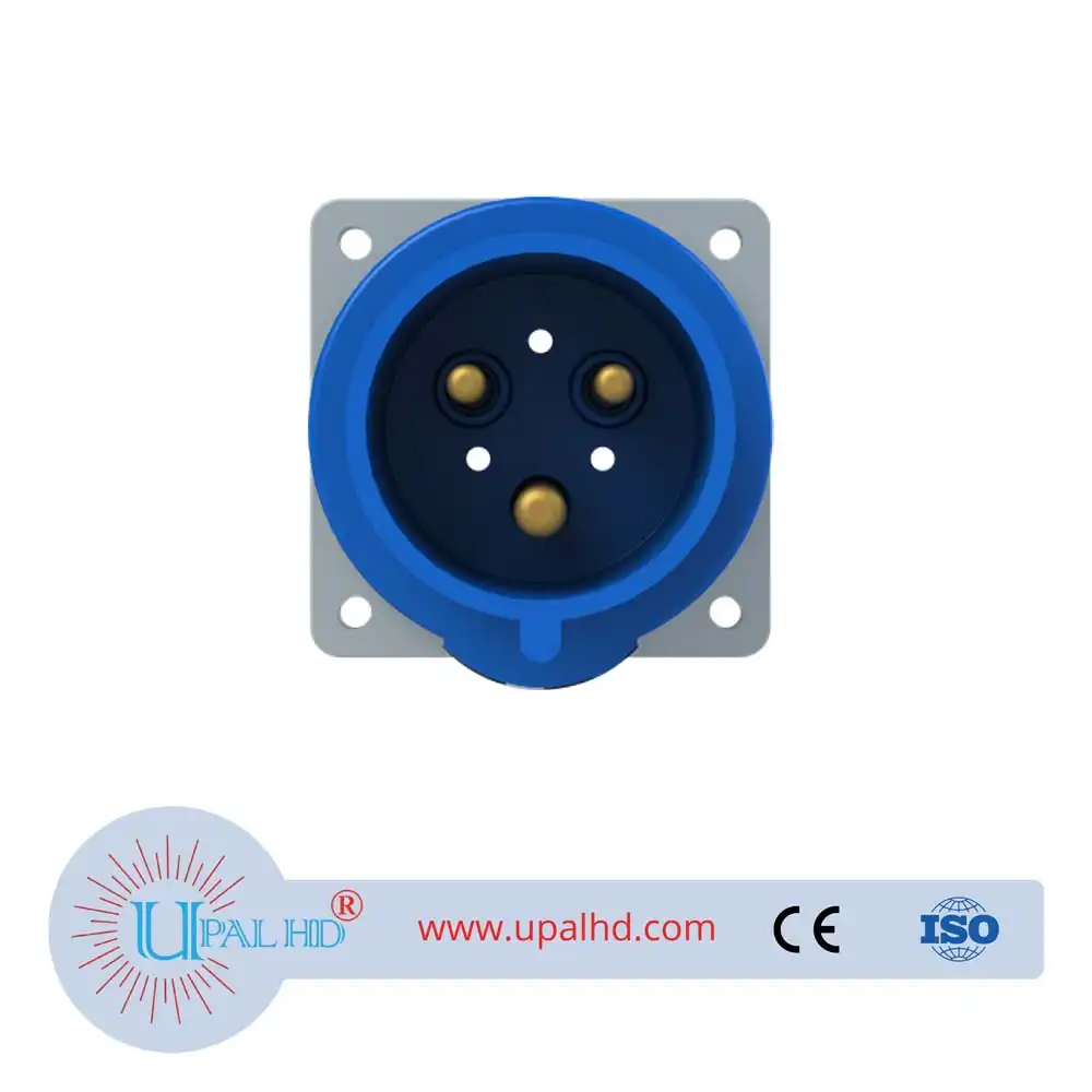 - Panel mounted inlet, earthing sleeve position 6h, rated current 32A, IP44 splashproof, unified flange, straight, 2-poles+earth, frequency 50-60 Hz, color code Blue.