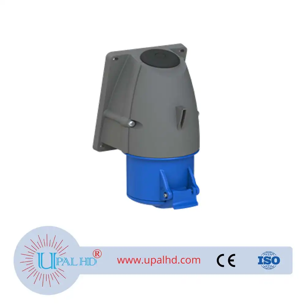 ABB industrial connector 32A three-phase 232RS6 female socket plug splash-proof IP44; 10091842.ABB Industrial Connectors Model No: 232RS6. Wall mounted socket, earthing sleeve position 6h, rated current 32A, IP44 splashproof, 2-poles+earth, frequency 50-60 Hz, color code Blue.