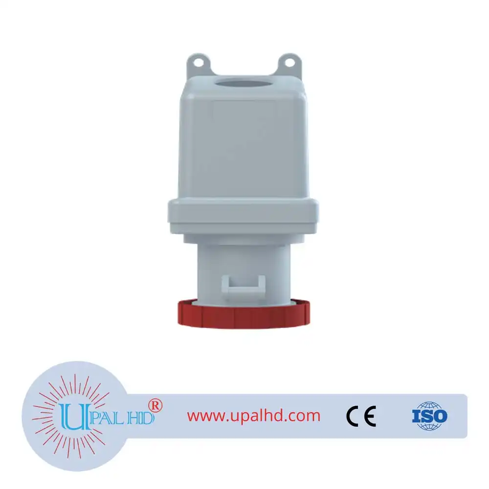 - Surface socket-outlet, earthing sleeve position 6h, rated current 63A, IP67 watertight, 3-poles+neutral+earth, frequency 50-60 Hz, color code Red