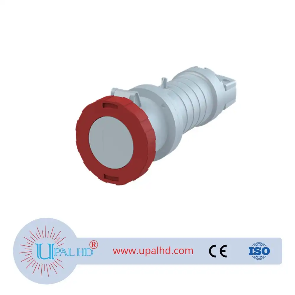 - Connector, earthing sleeve position 6h, rated current 63A, IP67 watertight, 3-poles+earth, frequency 50-60 Hz, color code Red.