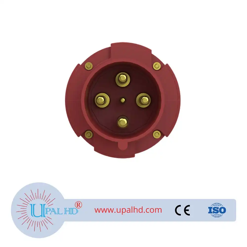 ABB industrial connector male female plug socket 63A four-phase 363P6 or 363-P6; 10091828.ABB Industrial Connectors Model No: 363P6. Plug, earthing sleeve position 6h, rated current 63A, IP44 splashproof, 3-poles+earth, frequency 50-60 Hz, color code Red.