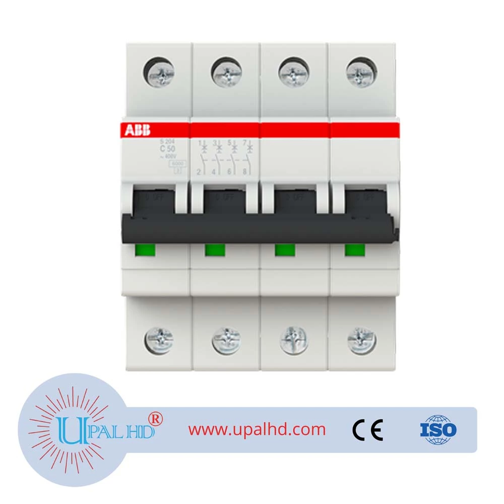 ABB micro air switch American standard UL circuit breaker short circuit protection 4p50A S204-C50; 10113694 Miniature circuit breakers and terminal distribution protection products Model Number: S204-C50 System pro M compact S200 miniature circuit breakers are current limiting. They have two different tripping mechanisms, the delayed thermal tripping mechanism for overload protection and the electromechanic tripping mechanism for short circuit protection. They are available in different characteristics (B,C,D,K,Z), configurations (1P,1P+N,2P,3P,3P+N,4P), breaking capacities (up to 6 kA at 230/400 V AC) and rated currents (up to 63A). All MCBs of the product range S200 comply with IEC/EN 60898-1, IEC/EN 60947-2, UL1077 allowing the use for residential, commercial and industrial applications. Bottom-fitting auxiliary contact can be mounted on S200 to save 50% space.