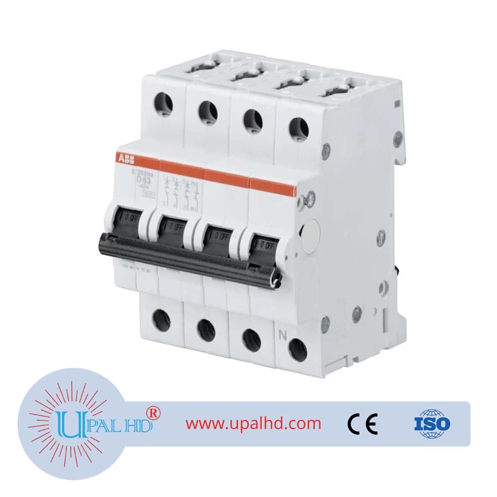 ABB miniature air switch American standard UL circuit breaker protection 63A/S203-D63 NA; 10113775 Miniature circuit breakers and terminal distribution protection products Model Number: S203-D63NA System pro M compact S200 miniature circuit breakers are current limiting. They have two different tripping mechanisms, the delayed thermal tripping mechanism for overload protection and the electromechanic tripping mechanism for short circuit protection. They are available in different characteristics (B,C,D,K,Z), configurations (1P,1P+N,2P,3P,3P+N,4P), breaking capacities (up to 6 kA at 230/400 V AC) and rated currents (up to 63A). All MCBs of the product range S200 comply with IEC/EN 60898-1, IEC/EN 60947-2, UL1077 allowing the use for residential, commercial and industrial applications. Bottom-fitting auxiliary contact can be mounted on S200 to save 50% space.