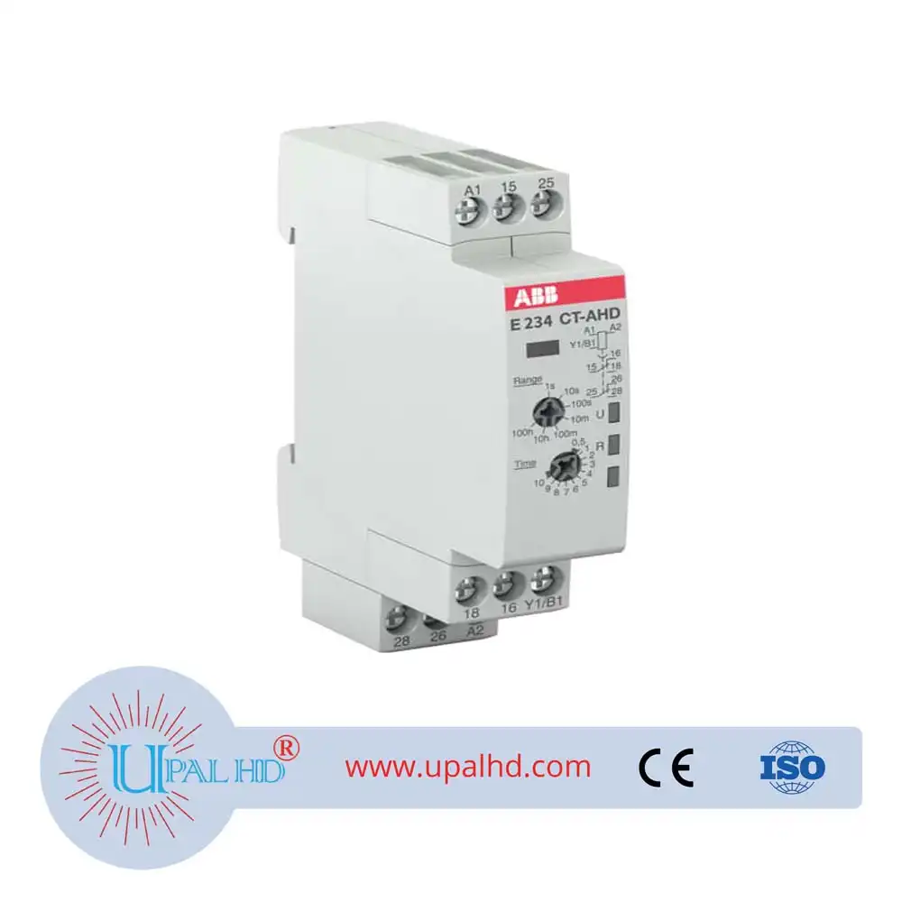 ABB official genuine electronic time relay monitor CT-AHD.22,24-240V AC.CT Time Relay Model No: CT-AHD.22. The CT-AHD.22 is a single-function electronic time relay from the CT-D timer range. It provides an OFF-delay (delay on break) function with 7 time ranges from 0.05 s to 100 h. This time relay operates with a rated control supply voltage of 24 – 48 V DC / 24 – 240 V AC and has a 2 c/o (SPDT) output with contacts rated at 250 V / 5 A. A control input works with voltage-related (non-floating) triggering. ABB official genuine electronic time relay monitor