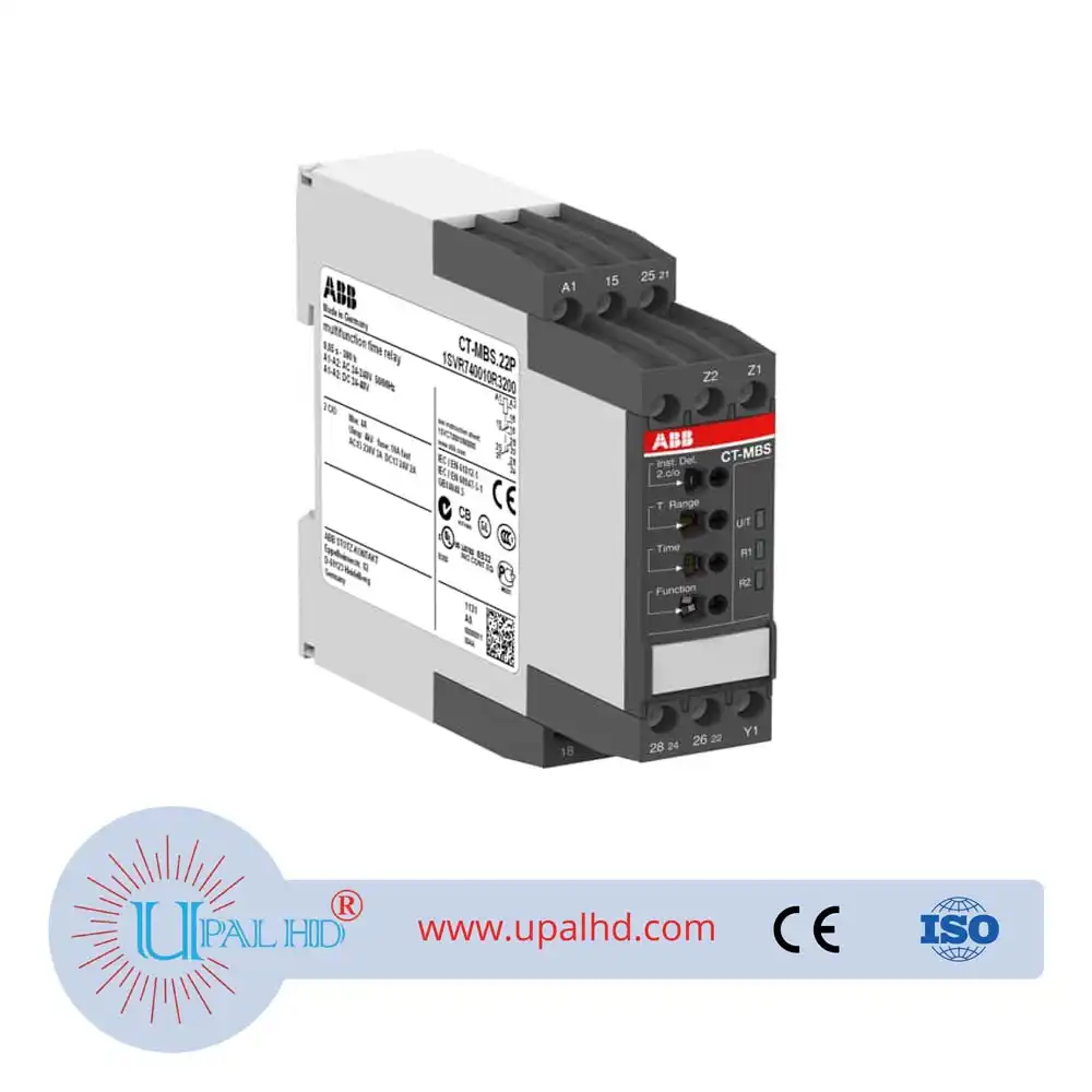 ABB official genuine electronic time relay monitor CT-MBS.22P,24-240VAC.CT Time Relay Model No: CT-MBS.22P. The CT-MBS.22P is a multifunction electronic time relay from the CT-S timer range. It provides 10 timing functions with 10 time ranges from 0.05 s to 300 h. This time relay operates with a rated control supply voltage of 24 – 48 V DC / 24 – 240 V AC and has a 2 c/o (SPDT) output with contacts rated at 250 V / 4 A. A control input works with volt-free (floating) triggering. The CT-MBS.22P offers the possibility of connecting a remote potentiometer for the fine adjustment of the time delay. The second of the c/o contacts can be selected as an instantaneous contact. A sealable transparent cover for protection against unauthorized changes is available as accessory. The device offers maintenance free Easy Connect Technology with push-in terminals. ABB official genuine electronic time relay monitor