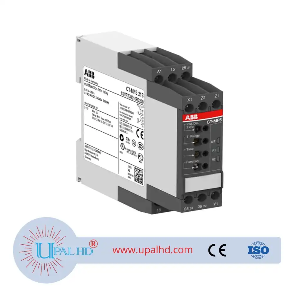 ABB official genuine electronic time relay monitor CT-MFS.21S, 24-240VAC. CT Time Relay Model No: CT-MFS.21S. The CT-MFS.21S is a multifunction electronic time relay from the CT-S timer range. It provides 10 timing functions with 10 time ranges from 0.05 s to 300 h. This time relay operates with a rated control supply voltage of 24 – 240 V AC / DC and has a 2 c/o (SPDT) output with contacts rated at 250 V / 4 A. Two control inputs work with volt-free (floating) triggering.The CT-MFS.21S offers the possibility of connecting a remote potentiometer for the fine adjustment of the time delay. The second of the c/o contacts can be selected as an instantaneous contact. A sealable transparent cover for protection against unauthorized changes is available as accessory. The device offers screw connection technology with double-chamber cage connection terminals.