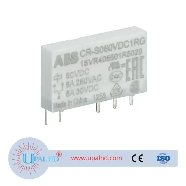 ABB pluggable ultra-thin intermediate relay CR-S005VDC1RG/10152421.CR-S Sheet relays Model No: CR-S005VDC1RG. The CR-S005VDC1RG is a slim pluggable interface relay, with gold-plated output contacts, which is suitable for direct mounting on a printed circuit board or use in conjunction with ABB’s sockets. Plugged into a socket, the combination of relay and socket may be seemlessly snap-on mounted onto a DIN Rail. This relay operates with a 05 V DC rated control supply voltage and has a 1 c/o (SPDT) output with contacts rated at 250 V / 6 A.This slim pluggable interface relays may be used for electrical isolation, amplification and signal matching. Its gold-plated contacts ensure contact reliability particularly necessary in applications where small currents and loads are to be switched. The CR-S relays are 6.2 mm wide and therefore allow for the switching of high currents on a small footprint. Moreover, CR-S relays are UL 94-V0 certified, improving safety by providing high levels flame retardation. Screw and spring sockets, jumper bars and markers are available as accessories.