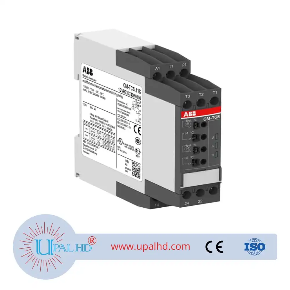 ABB PT100 temperature monitoring relay CM-TCS.11S, 10111679. CM Monitoring Relay Model No: CM-TCS.11S. The CM-TCS.11S relay is from the CM temperature monitors range. This relay operates with a rated control supply voltage of 24 – 240 V AC / DC and has a 2 c/o (SPDT) output with contacts rated at 250 V / 4 A. The CM-TCS.11S is able to measure temperature with 1 sensor circuit using PT100 sensor. The CM-TCS.11S monitors overtemperature, undertemperature and window monitoring with 2 thresholds. The corresponding threshold values are adjustable. The temperature measuring range is -50..+50°C. A sealable transparent cover for protection against unauthorized changes is available as accessory. The device offers screw connection technology with double-chamber cage connection terminals. ABB PT100 temperature monitoring relay