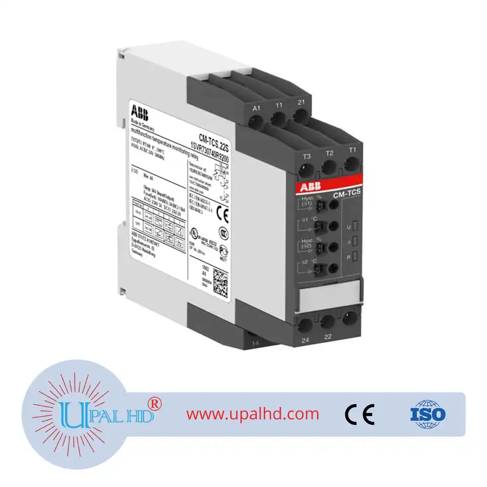 ABB PT100 temperature monitoring relay CM-TCS.22S, 24VAC/DC, 10111683 . CM Monitoring Relay Model No: CM-TCS.22S. The CM-TCS.22S relay is from the CM temperature monitors range. This relay operates with a rated control supply voltage of 24 V AC / DC and has a 2 c/o (SPDT) output with contacts rated at 250 V / 4 A. The CM-TCS.22S is able to measure temperature with 1 sensor circuit using PT100 sensor. The CM-TCS.22S monitors overtemperature, undertemperature and window monitoring with 2 thresholds. The corresponding threshold values are adjustable. The temperature measuring range is 0..+100°C. A sealable transparent cover for protection against unauthorized changes is available as accessory. The device offers screw connection technology with double-chamber cage connection terminals. ABB PT100 temperature monitoring relay