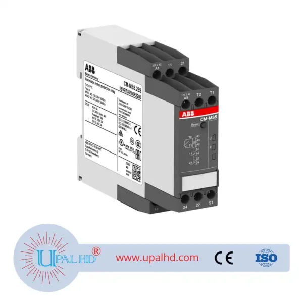ABB thermistor motor protection relay CM-MSS.23S/10156603 . CM Monitoring Relay Model No: CM-MSS.23S. The CM-MSS.23S belongs to the CM-MSS thermistor motor protection relay range. It operates with a rated control supply voltage of 110-130 V AC and 220-240 V AC and has a 2 c/o (SPDT) output with contacts rated at 250 V / 4 A. It features one sensor circuit to monitor PTC temperature sensors and works according to the closed-circuit principle. The relay can be reset automatically, manually or remotely after the failure has been removed. A sealable transparent cover for protection against unauthorized changes is available as accessory. The device offers screw connection technology with double-chamber cage connection terminals. ABB thermistor motor protection relay