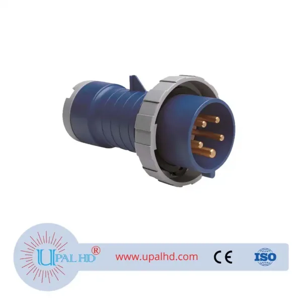 - Plug, earthing sleeve position 9h, rated current 32A, IP67 watertight, 3-poles+neutral+earth, frequency 50-60 Hz, color code Blue.