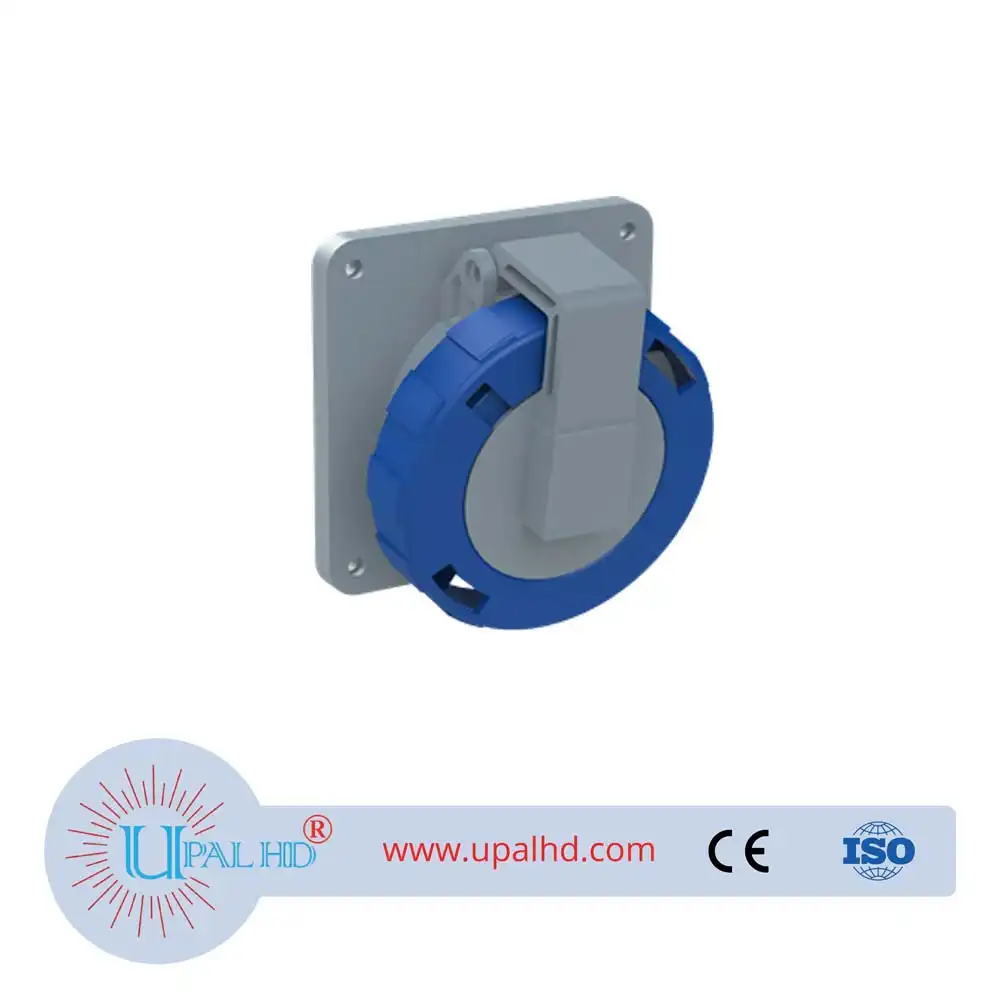 - Socket-outlet, panel mounting, earthing sleeve position 9h, rated current 32A, IP67 watertight, unified flange, angled, 3-poles+neutral+earth, frequency 50-60 Hz, color code Blue